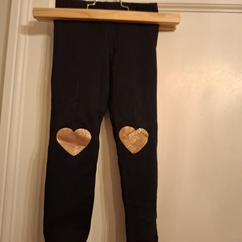 H&M leggings for jente i størrelse 104. Bukse i svart bomull med strikk i livet. Modellen har påsydde hjerter på knærne i kontrastfarge. Egnet som hverdagsbukse eller under tunika og kjoler. Materiale ifølge merkelapp: bomull.