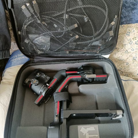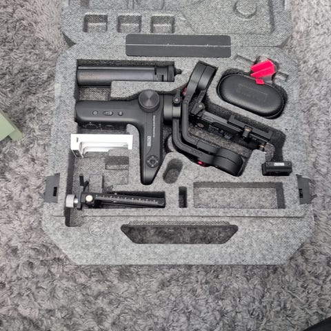 DJI Ronin-SC kameragimbal for stabilisering av kameraer for fotografering og video. Gimbalen leveres med håndgrep, kabler, lader, strømadapter og bæreveske som vist på bildene. Passer til speilløse kameraer innenfor vekt- og størrelsesgrensene til Ronin-SC. Flere monteringspunkter og justeringsalternativer gjør det mulig å balansere forskjellige kamerarigger og objektiver for jevn og stabil opptakskvalitet.