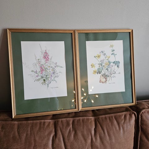 Ukjent merke sett med innrammede bilder med asiatisk inspirerte motiver. Motivene viser blant annet fugler, blomster og hane i farger og svart-hvitt. Bildene er montert i rektangulære og kvadratiske rammer med gullfarget metallkant og glass i front. Baksiden har opphengsbeslag for veggmontering. Egnet som veggdekor i stue, gang, soverom eller kontor.