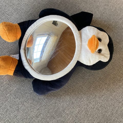Plysj nattlampe i blå og lyse farger. Lampen har et hardt, mørkt plastskall på toppen med stjerneformede hull som projiserer lysmønster i tak eller på vegger av fisker som svømmer. Resten av figuren er i mykt plysjmateriale, med myke bein/poter rundt. Egnet som nattlampe eller kosefigur på barnerom. Kan også spille av lyd.
