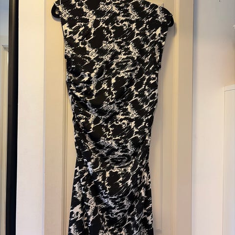 H&M hverdagskjole i viskose, størrelse S. Kjolen er flerfarget med et abstrakt mønster i hovedsakelig brune, hvite og blå toner. Modellen har lange ermer, krage og knepping foran øverst, samt et knytebelte i livet. Passer som hverdagskjole til dame.