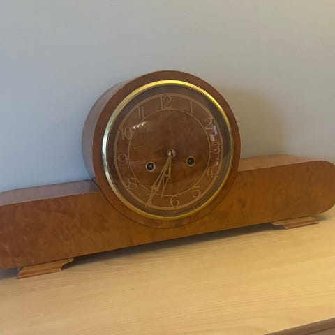 Klokken fungerer ikke, men gjør seg godt som pynt i hylla. Klokken er av nyere tid ettersom den bruker batteri, jeg har kjøpt den på et marked for noen år siden
