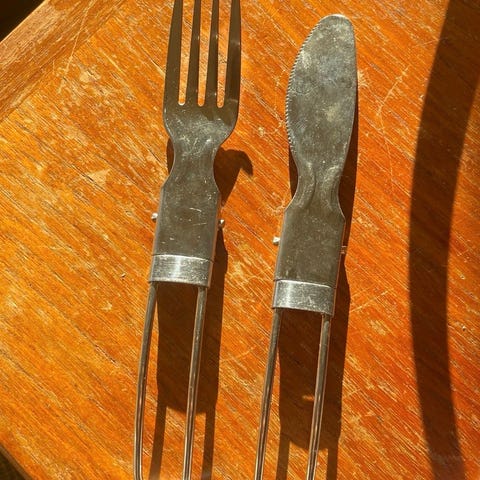 tresett turbestikk, kniv og trekopp natur