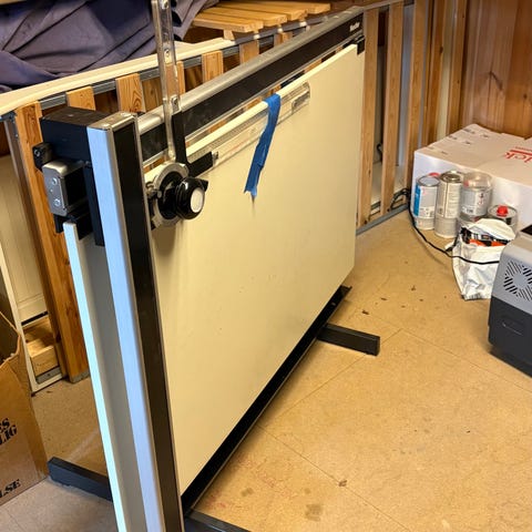 Unic tegnebord med parallellinjal. Bordet har justerbar helning og solid søylefot i metall. Arbeidsflaten er rektangulær og egnet for teknisk tegning, arkitektarbeid eller annet presisjonsarbeid på papir. Parallellinjal er montert på bordet for nøyaktig linjetegning. Passer til bruk på kontor, atelier eller verksted der det er behov for et stabilt tegnebord.