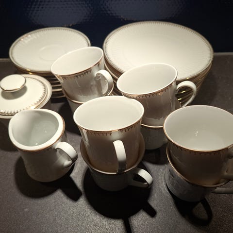 Det er 7 kopper og 7 asjetter samt sukker og fløtemugge.