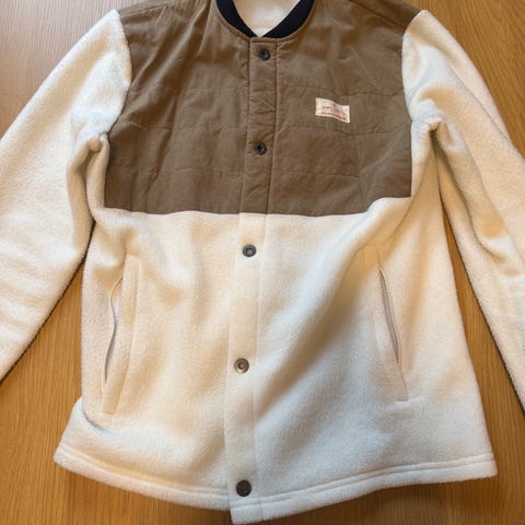 Amundsen jakke i fleece i offwhite og brun farge, størrelse L. Jakken har knappelukking foran og to frontlommer med glidelås. Kontrastfelt på skuldre og ermer gir et todelt uttrykk i brun og lys tone. Egnet som ytterlag eller mellomlag til hverdagsbruk og tur. Laget for herre i normal passform.