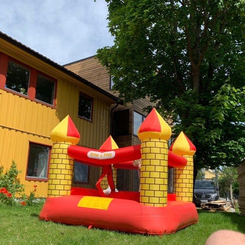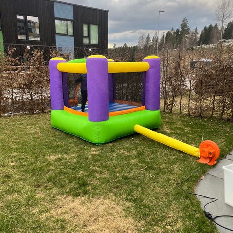 Hoppeslottet er i god stand og fungerer fint, men den har bruksmerker.