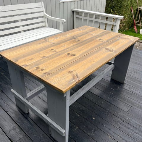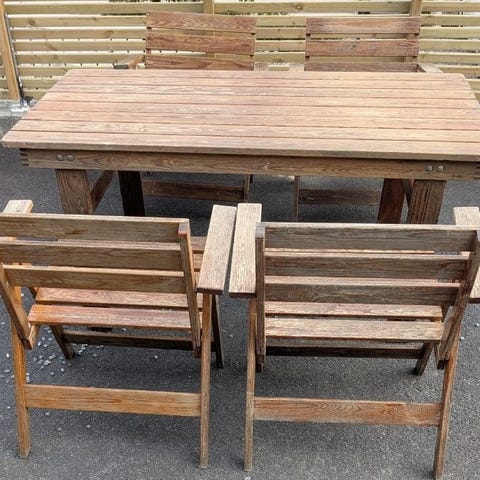 Terrassebord og seks stoler selges for 2000. Møblene er 3 år gamle og er lite brukt. Treverket er misfarget pga det har stått ute i regn, ellers er det i helt fin stand.