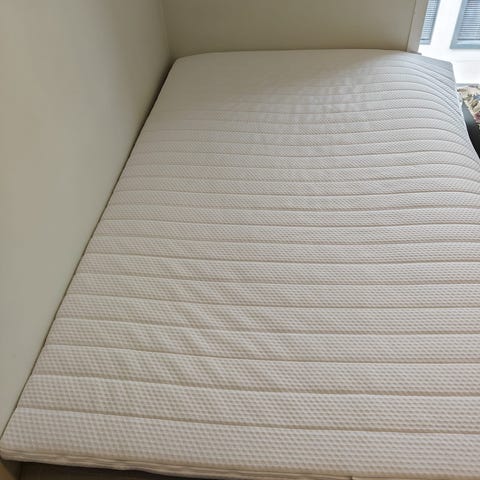 Seller seng med madrass fast og medium . Den type seng som du kan velg , en side er fast og andre side er medium . Lit usikker fra hvor seng er , når jeg kjøpte hus den seng var med , og tror han sa var fra Bohus . Overmadrassen kan følg med . Alle trekk på seng kan ta vekk og vask , madrassen , overmadrassen og seng karpe .