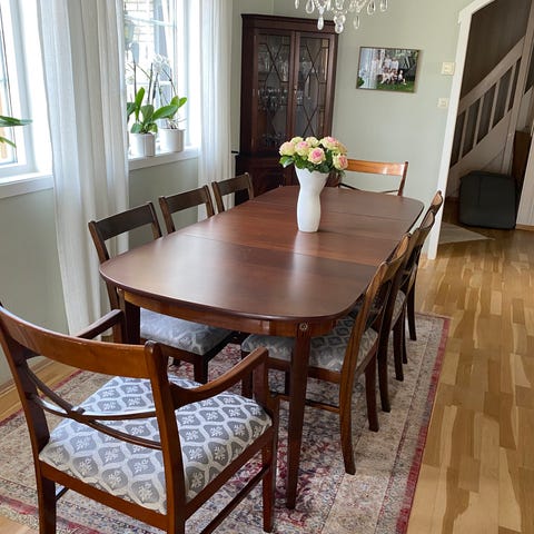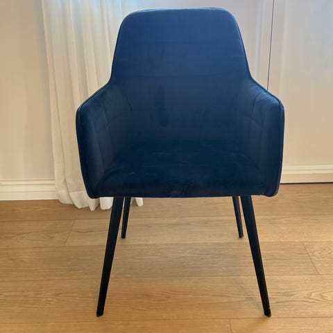 Møbelringen spisestuestoler med høy rygg i grått tekstiltrekk med mørke treben. Stolen lett buet rygg og polstret sete for god sittekomfort. Passer til spisestue eller kjøkken. Selges som sett, antall etter avtale med selger. Stol koster 3599. pr.stk. NÅ kr 2500. pr.stk.