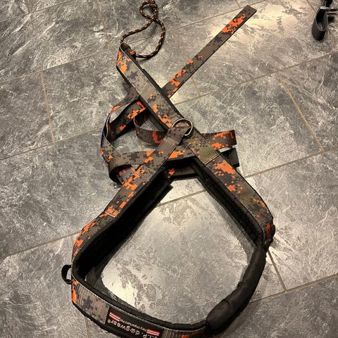 Selger en praktisk og slitesterk hundesele i svart med blå detaljer. Selen er godt polstret og gir god komfort for hunden, samtidig som den sitter stabilt ,brukt veldig lite .