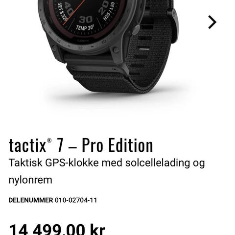 Selger min Garmin Tactix 7 Pro Ballistics Edition (as is) grunnet oppgradering til Tactix 8. Ny klokke fra Garmin i juni 2025, grunnet reklamasjon. Noen mindre slitemerker på ringen. Kan ikke se en ripe på glasset. Original box. Faktura på kjøp tilgjengelig + dokumentasjon fra Garmin vedr reklamasjon.