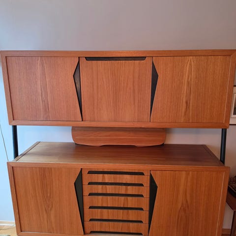 Retro teak skjenk med skuffer og dører på hver side.