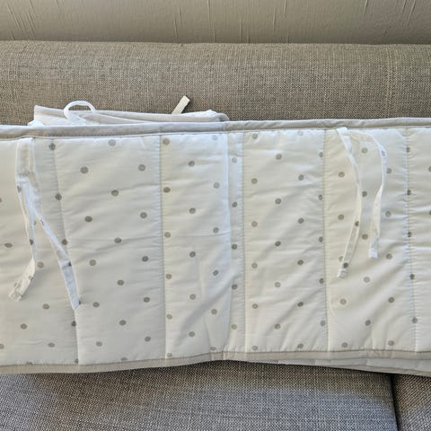 Sengekant til sprinkelseng. Fargen er en dempet grønn/grågrønn tone. Den har rynkekant/detaljer på utsiden for et teksturert uttrykk (Må strykes). Egnet til bruk i babyseng eller sprinkelseng for å skape en mykere avgrensning rundt barnet.