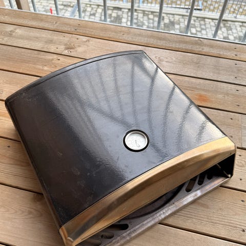 Egner seg til steking av pizza og annen mat som krever høy og jevn varme utendørs. Leveres med pizzastein, termometer og gass-tilkobling slik som vist på bildene av esken og innholdet.