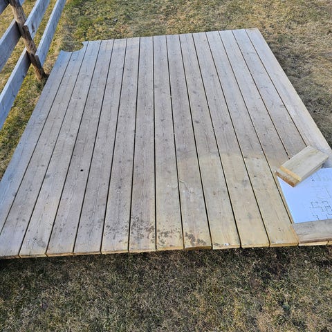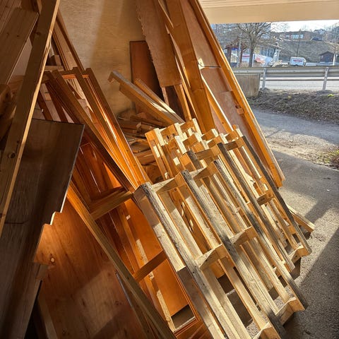 Gjenbrukt trevirke bestående av bord og planker i ulike lengder. Har vært terrassegulv.