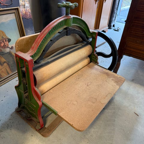 Antikk manuell klesrulle. Konstruksjonen består av kraftig metallstativ med tannhjul og sveiv, samt trevalse og arbeidsflate i tre. Egner seg som bruksgjenstand for tradisjonell klesrulling eller som dekorativt innredningselement i for eksempel vaskerom, hytte, låve eller andre miljøer med historisk preg. Vi har brukt det som et serveringsbord på selskapslåve, men vi har to og trenger kun en.