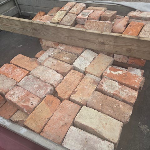 Vi tar ned to tegelstensvegger i kjeller i forbindelse med pigging. Høy kvalitet, hardtbrent, rød, se bilde. Veggene er makt m silikatmaling og tynt slemmet m kalkbetong som er porøst og enkelt fjerne. Veggene er 4,5 m x 2 m. Egner seg til bruk i restaurering og murerprosjekter eller byggeformål der gjenbruk er aktuelt.
