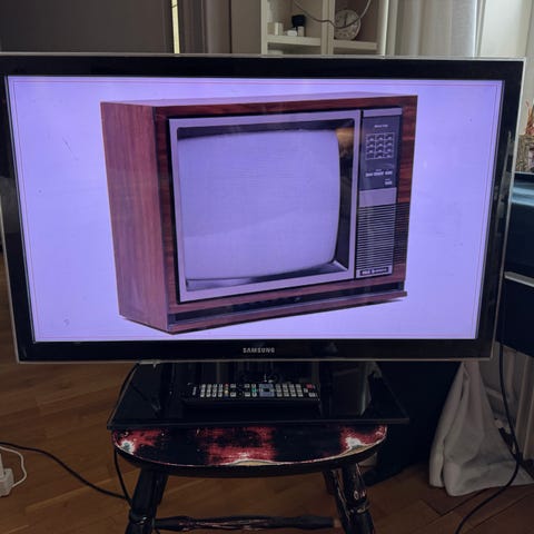 Kun TVen og kabel til strømtilkobling som følger med. Har ikke fjernkontroll, men knapper på siden av TVen kan brukes.