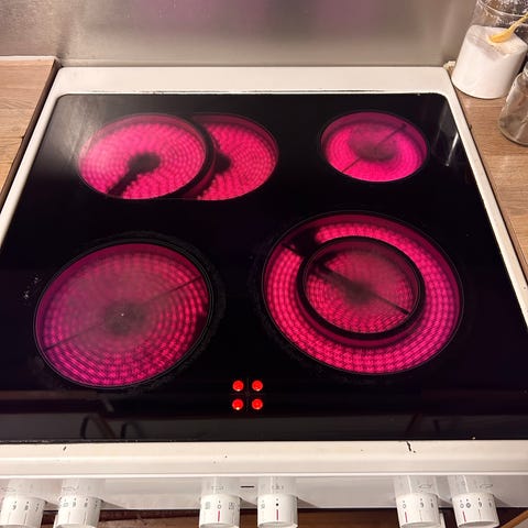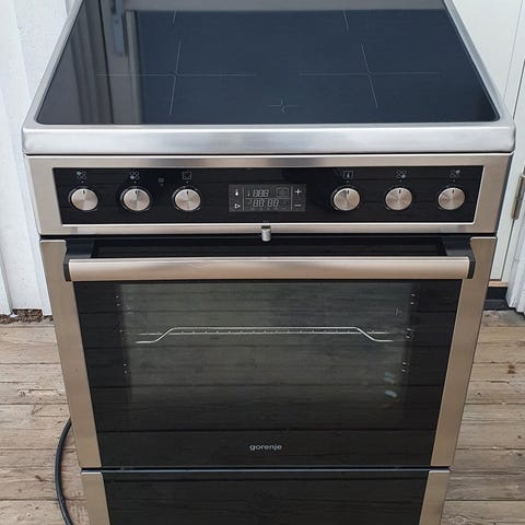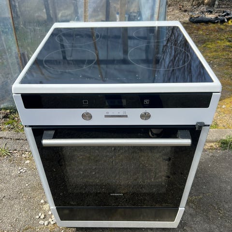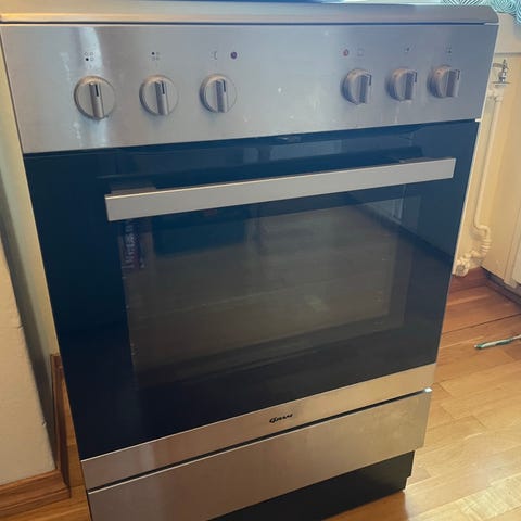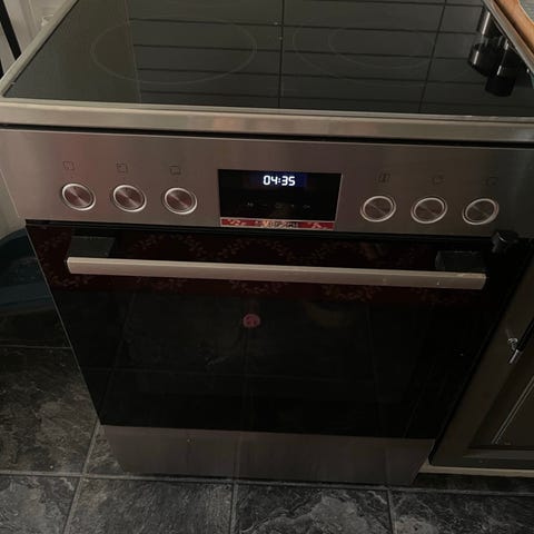 Selger en pålitelig, frittstående Bosch komfyr i stilig utførelse av rustfritt stål. Komfyren har keramisk glasstopp med fire kokesoner.