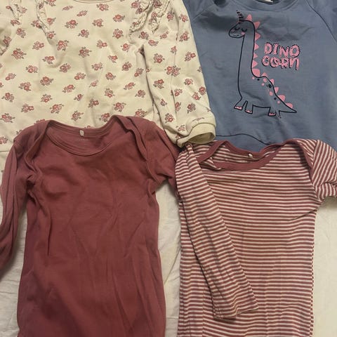 Selger en ullpakke bestående av tre overdeler og tre bodyer i str 98/104. Merker som joha, janus oh hust&claire. Noen flekker, me ingen hull som jeg kan se