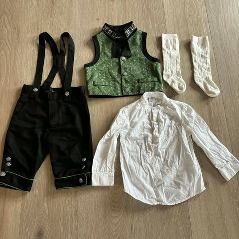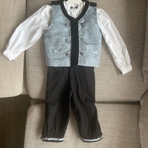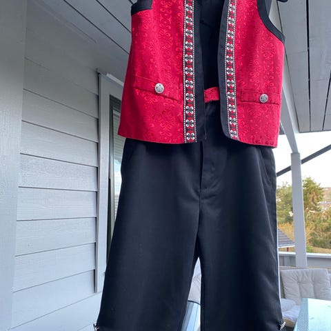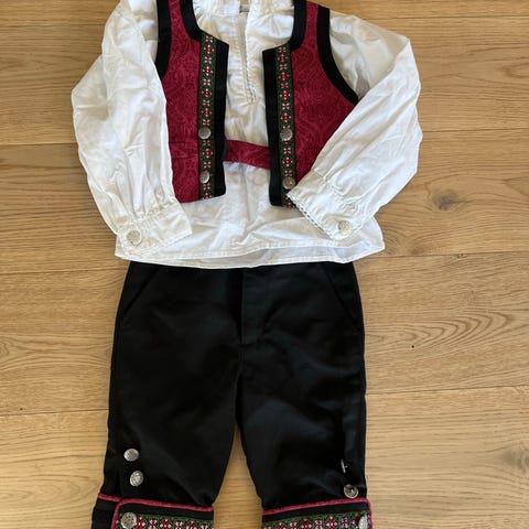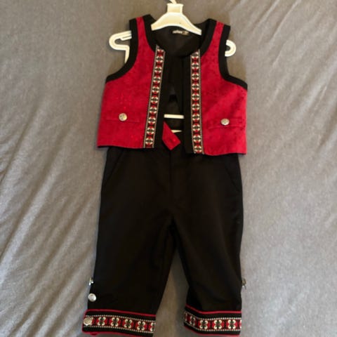 Reflex bunadsett for gutt i størrelse 104. Sett i bomull med flerfargede detaljer. Består av svart bukse med seler og dekorbånd nederst på bena, samt rød vest med mønstret bånd og dekorative knapper. Egnet som penklær til høytider og andre anledninger der bunadsinspirert antrekk ønskes.