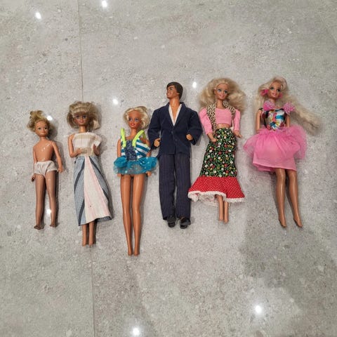 Sett med flere dukker med lange hvite kjoler i brudestil. Kjolene har ulike snitt og detaljer, blant annet puffermer, blonder og lag med tyll. I tillegg følger det med løse hvite kjoler og tilbehør som slør og hårbånd. Passer til lek eller som samlerobjekter for dukker i standard størrelse (typisk motedukker).