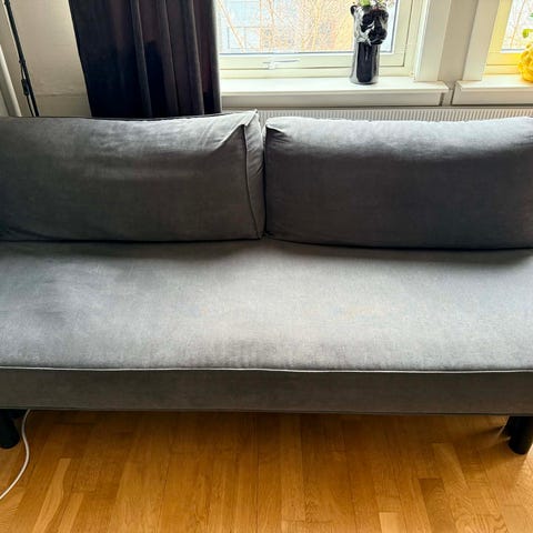 Pent brukt grønn sovesofa gis bort Lengde 230 cm, dybde på sete 85 xm og lengde på sjeselongen 160 cm. Hentes på Klokkerstua i Hurum