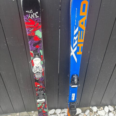 Begge par er utstyrt med alpintbindinger som kan justeres til passende skostørrelse innenfor bindingenes justeringsområde.