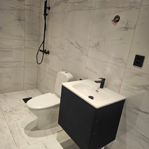 Baderom gulvbelegg i grå/blå/hvis farge med små, jevnt fordelte prikker. Passer til bruk på bad eller toalettrom.
