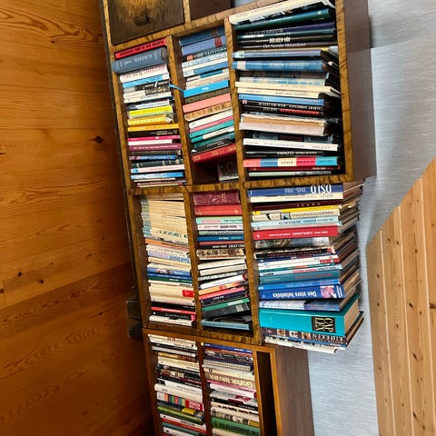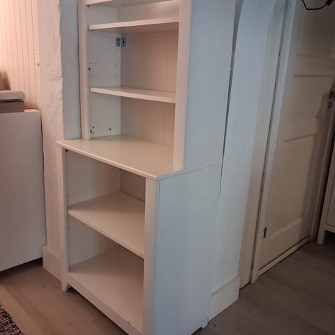 Svært pen vegghengt bokhylle selges. Kan monteres samlet eller hver for seg. Ble montert og malt i klassisk hvit, men har ikke blitt hengt opp og brukt.