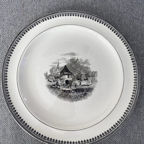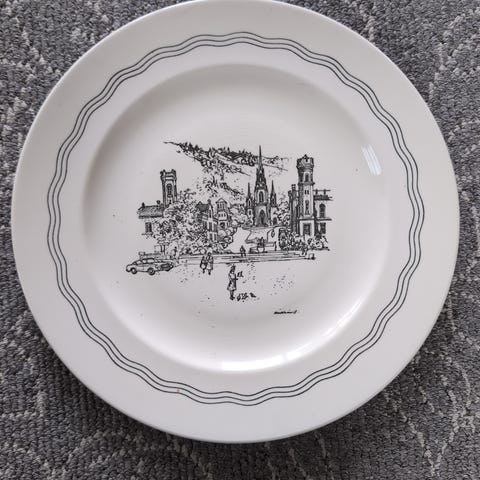 Fat fra Stavangerflint med bilde fra Trondheim og med logo TJ ( Trondheim Jernindustri) 10 stk med likt bilde. Flere krakilert. Selges samlet. Kom med bud. Kan fraktes Kvikne/Orkanger/ Melhus