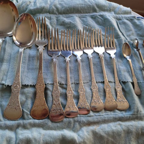 Bestikksett i sølvfarget metall med ulike deler. Bildet viser gafler og skjeer i forskjellige størrelser og design, inkludert spisegaffel, dessertgaffel, teskje og serveringsskje. Bestikket kan brukes til servering og daglig bruk ved borddekking.