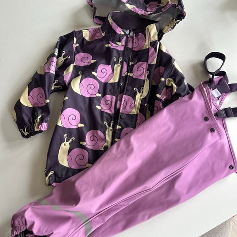 Pent brukt regnsett fra Petite Cherie i størrelse 98/104.
