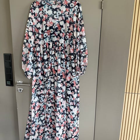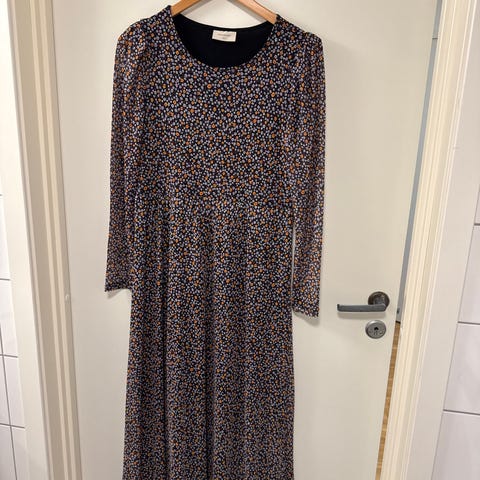 InWear hverdagskjole for dame i størrelse 40. Kjolen er laget i polyester og har et flerfarget mønster på mørk blå bunn. Modellen har 3/4 lange ermer med splitt og rund hals. Stoffet er glatt og litt tungt og faller rett ned. Legg foran i skjørtet gjør at den er meget pen på. Lengden er til rett over kneet. Den er egnet til bruk i hverdagen eller til enkle, pene anledninger.