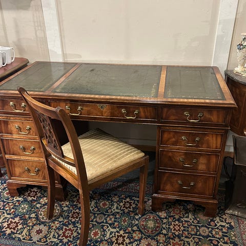 Et flott Engelsk skrivebord i Chesterfield stil, med flere skuffer, inkl. nøkkel.