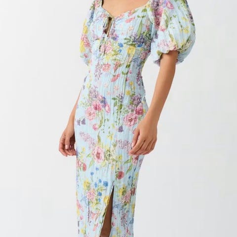 Gina Tricot sommerkjole i størrelse M for dame. Kjolen er laget i viskose og har et flerfarget blomsterprint. Modellen har lange ermer og figurnær passform med utringning foran. Stoffet er lett og mykt, egnet for bruk i varmt vær eller som en lett kjole til hverdags og fritid.