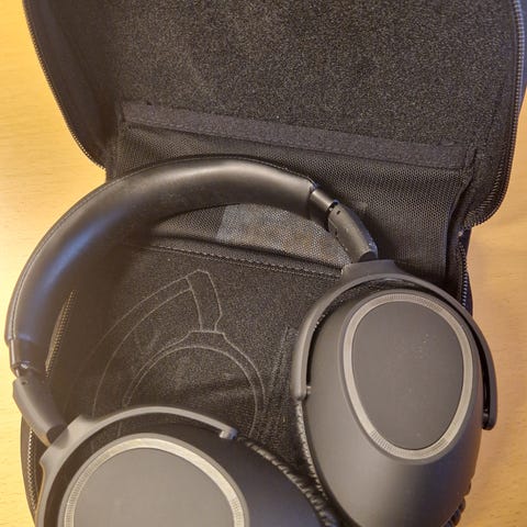 Sennheiser trådløse hodetelefoner over-ear i Graphite farge. I etuiet følger det med USB-kabel for lading, lydkabel og flyadapter.