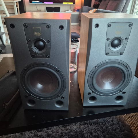 Et par med Dali SR-5 bokhylle-/bak-høyttalere selges. Noen bruksmerker på sidene men frontene er i grei