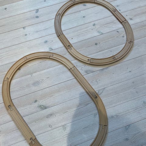 Togbane treleker. Inneholder ulike deler til togbane i tre, som skinner, broer og tog. Delene er laget i tre med enkelte plastdetaljer og kommer i en blanding av farger. Egnet som byggesett for barn som liker tog og konstruksjonslek. 250,-