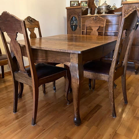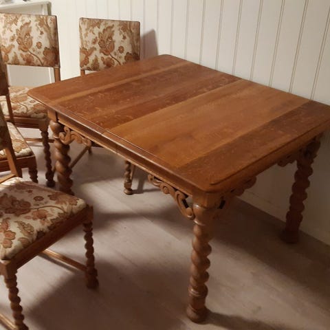Solid spisebord og stoler i massiv eik. Trolig fra 1940-1950. Sandblåst ca. 1995.