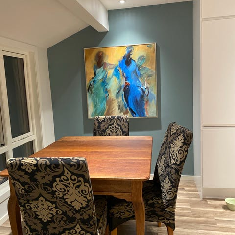 Settet inkluderer fire stoler med polstrede seter som er trukket om. Mål på setene: høyde 88, sittehøyde 48, dybde 45 og bredde 44 cm.