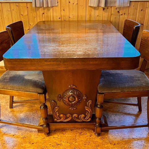 Utskjæringer på bordets sokkel og på stolryggene og bena.