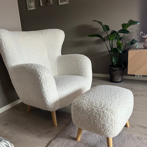 Preston hvilestol er en trendy flott suppleringsstol med et omsluttende og organisk design. Stolen kommer i et mykt og godt offwhite teddy-tekstil som er lett nuppet, men samtidig mykt og behagelig. Det litt store og omsluttende stolsetet i kombinasjon med tynne og lette ben, gir den den moderne looken. Den passer like godt inn som en lys og lett brytning i stuen, som et moderne element i walk-in garderoben eller som en godstol i gangen. Preston hvilestol er absolutt en flott stol som er både leverer god komfort og ikke minst har et nydelig nordisk samtidsdesign.