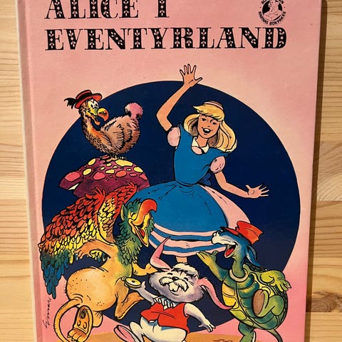 Alice i Eventyrland bildebok for barn. Lewis Carroll, Ellen Bjølseth, Einar Lagerwall. Boka er illustrert i farger med tegninger av Alice og figurene fra eventyret. Inneholder tekst med tilhørende helsides illustrasjoner på hver oppslagsside. Passer som høytlesningsbok eller for barn som leser selv. Hard perm med motiv av Alice og eventyrfigurene på forsiden og kaninmotiv på baksiden.