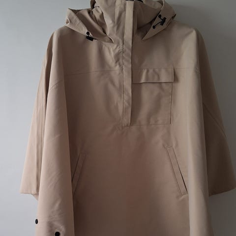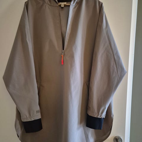 Fransa regnponcho for dame i størrelse S/M. Jakken er beige og laget av 100 % polyester. Modellen er en regnanorakk med halv glidelås i halsen og hette. Den har stikklommer foran, lange ermer med mulighet for stramming nederst og håndvarmere. Passformen er ledig, og materialet er beregnet for bruk som regntøy i vått vær.