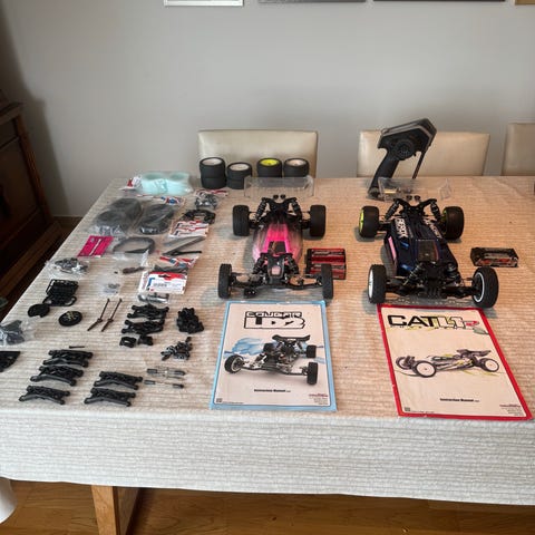 Det følger med en haug med reservedeler - Støtfangere, lader, 2 stk 3S-batteri, 3 stk 2S-batteri, karosserier, hjul, væsker og oljer, dempere, bærearmer, drivaksler osv osv osv. Av mest interesse kan være at jeg har kjøpt justerbare motorfester, som gjør det lettere å gire dem dit du ønsker dem. Akkurat nå er begge litt overgiret, og blir varm hvis du kjører mange speedruns etter hverandre. Det finnes fortsatt justeringer, oppgraderinger og potensiale for mer fart eller bedre handling for den som måtte ønske.
