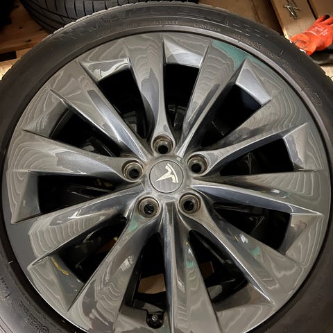 21 tommer. Vær oppmerksom på at felgene har tydelige bruksmerker ("kantkjøring") rundt kanten ). Dette er rent kosmetisk – felgene er rette, har ingen sprekker og har aldri vært sveiset eller reparert. De fungerer perfekt som de er, eller de kan bli som nye med en puss og lakkering.
