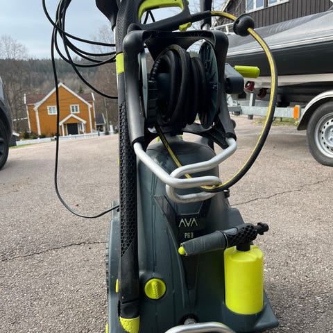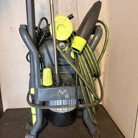5 år gammel AVA høytrykkspyler i grå farge. Enheten har integrert slangetrommel med høytrykksslange og bærehåndtak. Det følger med lanse og pistolhåndtak som kan festes på maskinen ved lagring. Høytrykksspyleren er egnet til rengjøring av uteområder, kjøretøy og andre overflater som tåler høytrykksvask.