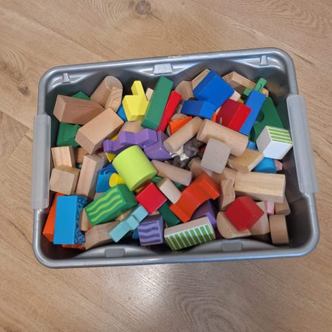 Selger en boks med fine treklosser i ulike former og farger. Her er det mye moro lek😊 Selges for 120 kr.